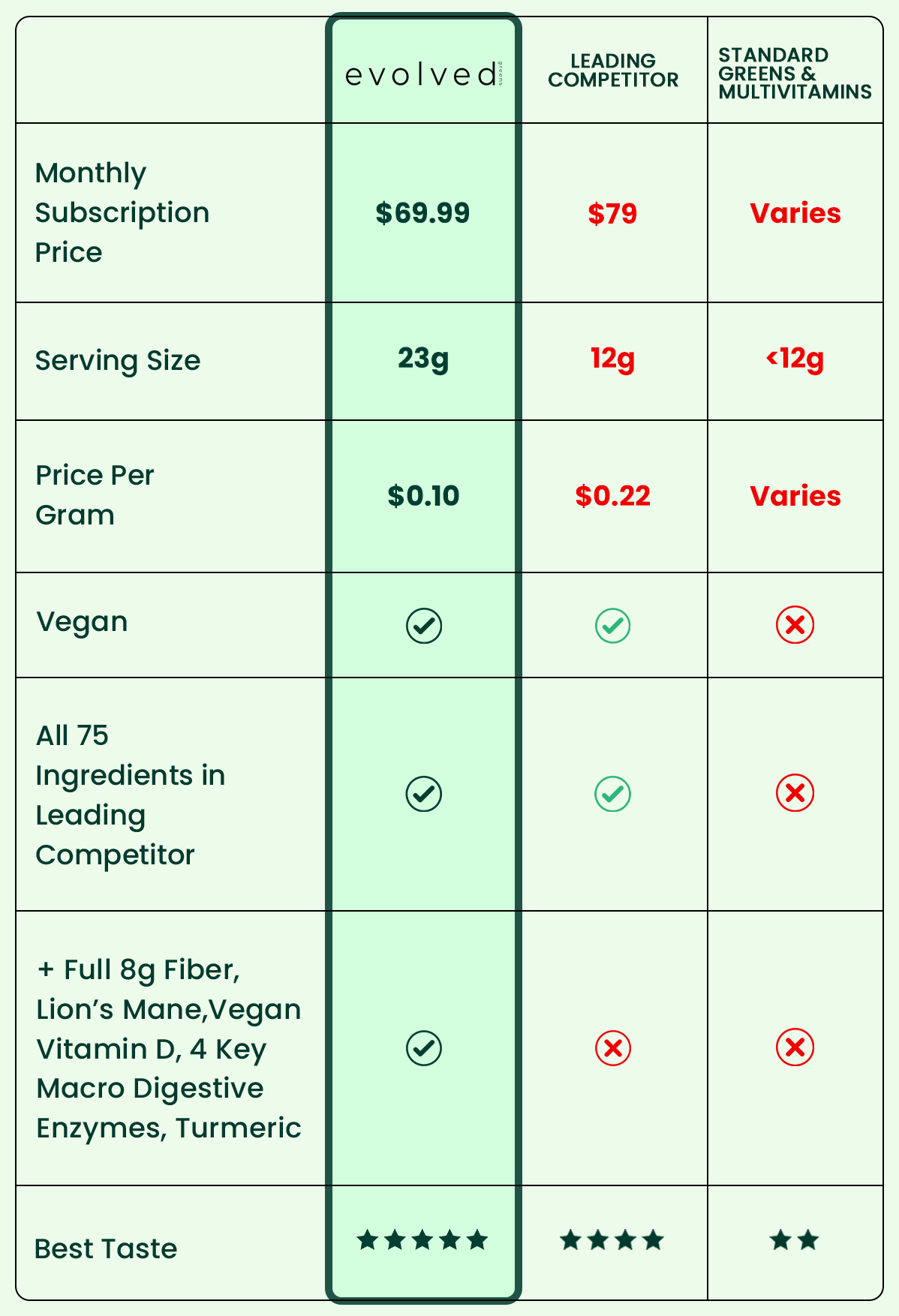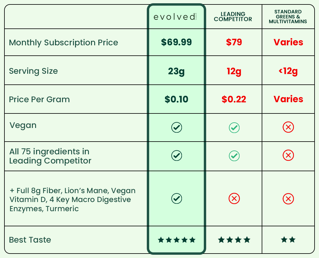 Does Evolved really have every ingredient the most expensive greens powder has, but for less $? What’s the catch?